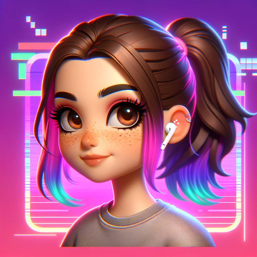 3D Memoji avatar style: Young woman with brown hair in a ponytail, cute freckles on nose and cheeks, hazel-brown eyes with long lashes, white wireless earbuds. BUT with edgy punk-rock twist: neon pink and electric blue hair highlights, confident smirk expression, glitchy digital effects around the edges, cyberpunk neon glow, gradient background from hot pink to electric purple. YouTube channel 'Krassmin' vibe - cute but rebellious. Keep the Memoji 3D cartoon aesthetic.